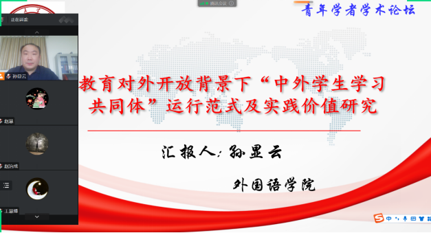 近日,外国语学院继续举办“青年学者学术论坛”。此次论坛采取线上线下相结合的方式进行,青年博士、教授孙显云作了题为“教育对外开放背景下‘中外学生学习共同体’运行范式及实践价值研究”的学术报告,全体专任教师参加了本次学术论坛。