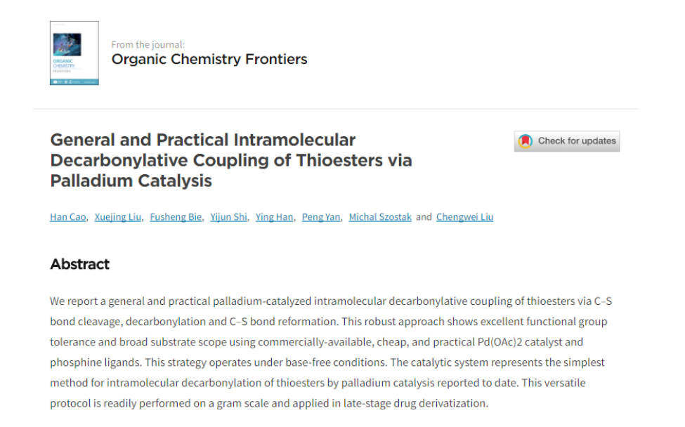 近日,鲁南煤化工工程技术研究院刘雪静科研团队在钯催化的硫酯的分子内脱羰偶联反应方面取得最新进展,相关工作发表在国际著名期刊《Organic Chemistry Frontiers》上,论文题目为《General and Practical Intramolecular Decarbonylative Coupling of Thioesters via Palladium Catalysis》,曹晗老师为第一作者,刘雪静教授为通讯作者,玩滚球的十大正规平台为第一单位。